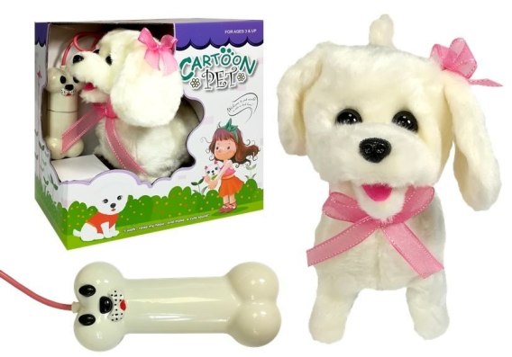 Pies na smyczy wykonany jest z miękkiego i nietoksycznego, który jest bardzo przyjemny w dotyku. Zwierzak ma duże, ciemne oczy, wystający ogonek i duży nos, który delikatnie błyszczy.   Ozdobiony jest różową wstążką, dodającą mu uroku. Zabawka posiada długą smycz zakończoną przełącznikiem w kształcie kostki, dzięki czemu dziecko w prosty sposób może sterować swoim pieskiem. Możliwość ta sprawia, że zabawa będzie wydawać się dziecku bardzo rzeczywista, a przede wszystkim ciekawa. Piesek posiada także kokardkę w kolorze różowym, która znacząco zwiększa urok zabawki.