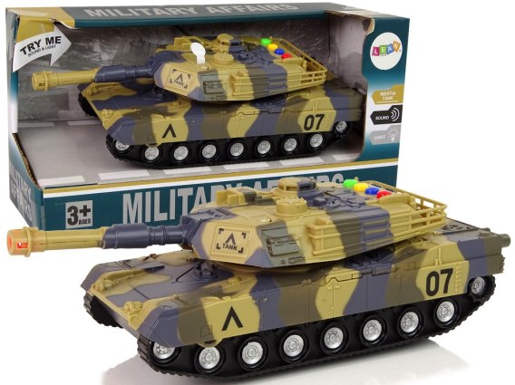Czołg ma kolorystykę wojenną- moro oraz gąsienicowe opony imitujące jazdę prawdziwego czołgu. Działo można obrócić ręcznie i skierować w odpowiednią stronę. Każdy szczegół jest identyczny jak w prawdziwym pojeździe. Cztery przyciski kryją wiele niespodzianek, które urealnią małą bitwę. Każdy z nich odtwarza inny efekty dźwiękowy -strzał, lecące samoloty czy pracę czołgu. Z działa wydobywa się czerwone światło oświetlające drogę strzału. Czołg to jeden z pomocników małej bitwy.