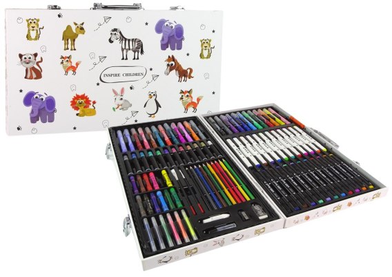 94 elementy - przy pomocy ogromnego wyboru kredek, mazaków, pasteli olejowych, ołówków, pędzelków, temperówki oraz gumek do mazania z łatwością stworzymy najbardziej wymyślne, kreatywne i oryginalne prace. Całość umieszczona jest w walizce, dzięki czemu transportowanie pełnej zawartości jest proste i komfortowe; dodatkowo posiada uchwyt umożliwiający wygodne przenoszeni. Po wykończeniu pierwotnych przyborów, można z powodzeniem zapełnić walizkę nowymi, własnymi akcesoriami. Osobne przegródki dają łatwy i szybki dostęp do potrzebnych rzeczy, a także zapewniają ich ochronę oraz utrzymanie porządku w walizce; bez kłopotu zabierzemy ją ze sobą wszędzie gdzie tylko zechcemy.