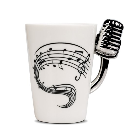 Elegancki kubek z uchwytem w kształcie mikrofonu.