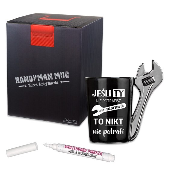 Napis na Kubku Złotej Rączki sprawi, że zrobi się cieplej na sercu każdemu - od dziadka pomocnego w naprawie samochodu, przez tatę, który skręcił nam biurko, aż po brata, który naprawił naszego laptopa. Mąż, który potrafi naprawić kapiący kran czy kolega pomocny w montowaniu półek, także chętnie napiją się z niego gorącej herbaty. Podaruj go na Dzień Ojca, Dzień Chłopaka, urodziny i na każdą inną okazję, podczas której chcesz podziękować naszej Złotej Rączce.
