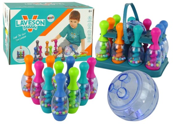 Zestaw składa się z 10 kręgli, kuli oraz praktycznego stojaka, który umożliwia wygodne przechowywanie wszystkich elementów. Kręgle mają wysokość 20 cm i wypełnione są kolorowymi kulkami, które wydają dźwięk grzechotki przy każdym zbiciu. Kula o średnicy 12 cm podczas rzutu mieni się kolorowymi wzorami, co dodaje zabawie atrakcyjności i przyciąga uwagę dzieci. Wszystkie elementy zostały wykonane z trwałego, bezpiecznego plastiku, co gwarantuje bezpieczeństwo użytkowania.