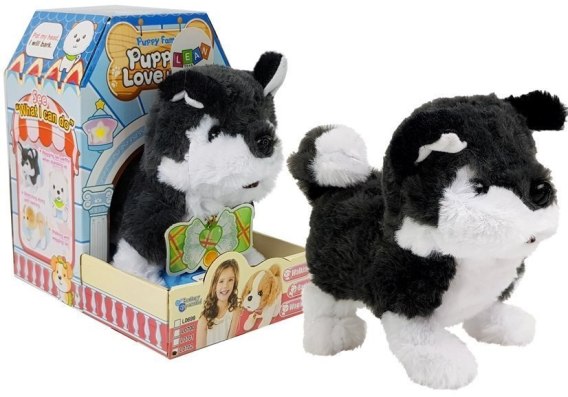 Biało - czarny, puchowy piesek Husky sprawia, że nie można oderwać od niego wzroku. Pies spaceruje, macha ogonkiem podczas stania. Po pogłaskaniu po głowie wydaje dźwięki i rozciąga się, zachowuje się jak szczęśliwy piesek. Dodatkowo otwiera pyszczek i wydaje odgłosy. Możesz wziąć swojego małego pluszowego przyjaciela na spacer, a zauważysz jak będzie merdać ogonkiem ze szczęścia.