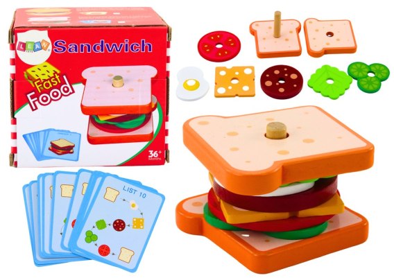 Zestaw drewniany kanapka składa się z 8 elementów i 10 kart z zamówieniami, które uczą dzieci składania kanapki według przepisów. Zabawa rozwija umiejętność rozróżniania kolorów, kształtów oraz składników.