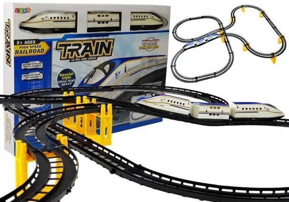 Całość toru ma długość aż  626 cm !! Dodatkowe konstrukcje mostu urozmaicą zabawę i dodają efektywności w wyglądzie kolejki. Sam pociąg jest utrzymany w barwach białych z pasami złotymi i niebieskim po bokach. Tory są w kolorze czarnym, natomiast most w kolorze żółtym co idealnie tworzy kontrast. Dużą zaletą jest zawrotna prędkość, kolejka mknie przez tory, a Twoje dziecko może cieszyć się zabawą.