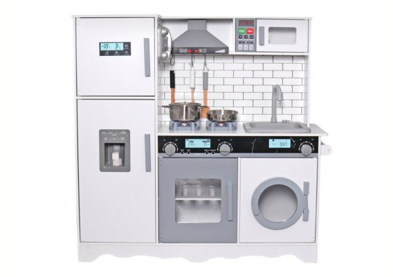 Dziecięca kuchnia Amelia rozwija kreatywność i samodzielność. Odpowiednie wymiary i mnóstwo interaktywnych elementów. Kolorystyka: biało-szara z czarnymi akcentami. Wspaniała zabawa i rozwijanie umiejętności dziecka.