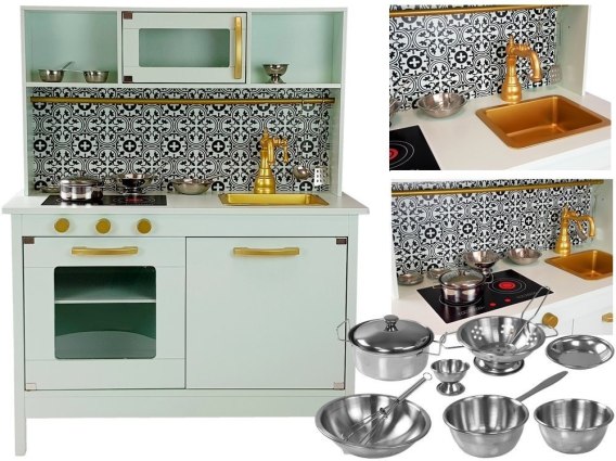Kuchnia posiada wiele pokręteł i drzwiczek co sprawi, że kilkulatek rozwinie swe umiejętności motoryczne i odruch chwytania przedmiotów o różnym kształcie. Cała kuchnia ma kolor miętowy z pięknymi złotymi pokrętłami i niespotykanym kranem. Blat ma  również kolor miętowy znajduje się na nim zlewozmywak i palniki, na który można gotować cudne potrawy. Nad zlewozmywakiem zamontowane są szafki, jedna z nich ma szybę i otwierane drzwiczki. Półeczki pod spodem  pozwolą na utrzymanie porządku oraz przechowywanie wielu garnków i produktów spożywczych. Do całości zestawu dołączone są super akcesoria do kuchni, dzięki którym można przygotować śniadanie, czy obiad. Pomiędzy górnymi i dolnymi szafkami jest piękny czarno- biały wzór, który zachwyci małego kucharza. Idealnie wpasuje się do każdego wnętrza, a zwłaszcza do pokoju dziecięcego.