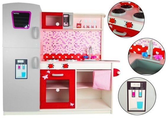 Drewniana kuchnia do złożenia z mikrofalówką, lodówką i kuchnią gazową to wyjątkowe miejsce do zabawy i nauki,