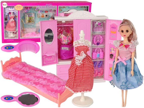 Lalka z Ubrankami Garderobą Pokój Meble Szafa Łóżko Akcesoria