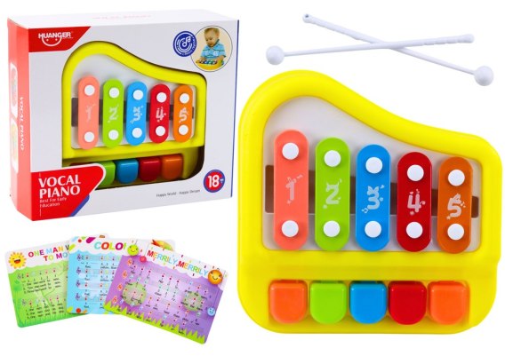 Zabawka, którą Państwu oferujemy to połączenie tradycyjnych cymbałków z pianinkiem - muzyczne metalowe płytki uderzane są dzięki kolorowym klawiszom. Kolejne tony reprezentowane są przez różne kolory i numerki, dzięki czemu dziecko może z łatwością zapamiętywać grane utwory, nauczyć się rozpoznawania kolorów i pięć pierwszych liczb. Stymuluje także rozwój podstawowych funkcji manualnych ręki oraz precyzję. To zestawy dołączone są z tego powodu plansze w utworami, w których nuty zapisane są w postaci kolorowych cyferek. Obudowa pianinka jest w jasnym, czerwonym kolorze, ma kształt miniaturowego fortepianu.