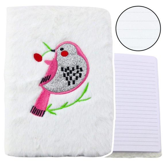 Wyjątkowy notatnik z miękką, futerkową okładką to idealny dodatek dla osób ceniących oryginalne i przytulne akcesoria. Okładka w białym kolorze ozdobiona jest wyszywaną aplikacją w postaci uroczego ptaszka w kolorach różu i srebra, co nadaje mu uroku.