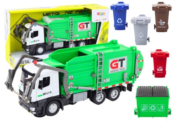Odkryj metalową śmieciarkę, która nie tylko sprząta, ale też bawi i edukuje dzieci. Jest wykonana w nowoczesnym stylu z zielonym wykończeniem, dodającym jej uroku.