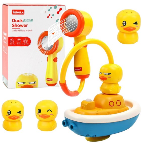 Zestaw posiada natrysk, który po uruchomieniu pompuje wodę i wypuszcza strumień niczym prawdziwa słuchawka prysznicowa. Dzięki zasilaniu bateryjnemu działanie zabawki jest płynne i wygodne. Wymienne główki kaczuszek różnią się wyrazami twarzy, co dodaje zabawie różnorodności i pozwala tworzyć własne scenariusze.